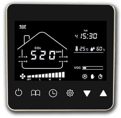Модель Салюс TkV-03 СО2 поставляется в комплекте с интеллектуальным контроллером воздуха. Который позволяет контролировать температуру в помещении, влажность, концентрацию CO2 в режиме реального времени. Выходной сигнал управляющего устройства может непосредственно контролировать скорость вентилятора.