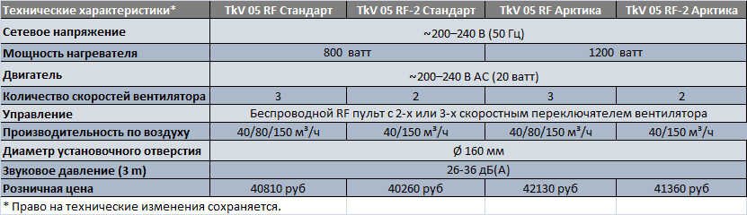 Приточные установки серии "Салюс TkV 05 RF (Арктика)" представляют собой укомплектованные агрегаты, содержащие электрический нагреватель мощностью 800 или 1200 Вт, вентилятор канальный осевого типа производительностью 240м3/ч, термодатчик и термопредохранитель, сдвоенный воздушный фильтр (EU3 + угольный), обратный клапан, соединительный воздуховод, внутреннюю и наружную решётку с москитной сеткой и комплектуются беспроводным RF пультом управления с 2-х или 3-х скоростным переключателем оборотов вентилятора и блоком питания и управления.